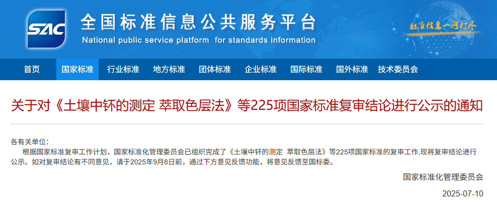 國家標準化管理委員會近日發布通知,對《土壤中钚的測定 萃取色層法》等225項國家標準的復審結論進行公示。根據公示內容,其中由生態環境部歸口管理的84項國家標準被建議廢止,且廢止過渡期為公告即廢止