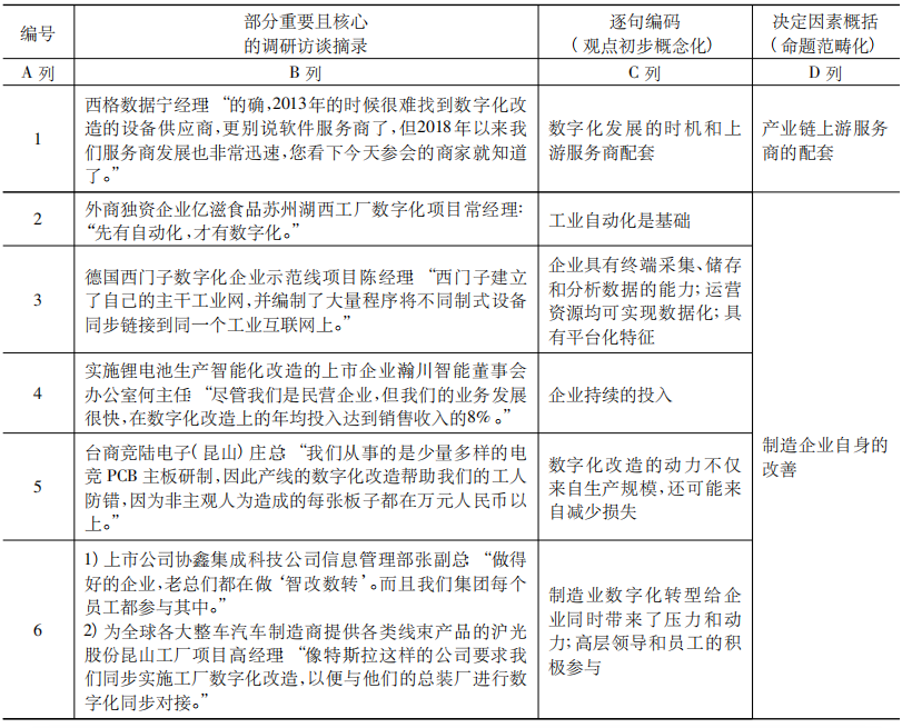 課題組運(yùn)用扎根研究方法,以蘇州制造業(yè)數(shù)字化改造專(zhuān)題調(diào)研的各個(gè)活動(dòng)為研究案例,設(shè)計(jì)了“制造業(yè)數(shù)字化改造決定因素”為主題的研究問(wèn)題和命題,并運(yùn)用扎根理論中調(diào)研記錄、數(shù)據(jù)的收集和分析方法,將參觀、調(diào)研、研討、訪談、座談過(guò)程中凡是對(duì)制造業(yè)數(shù)字化改造產(chǎn)生影響的因素進(jìn)行了編碼匯總,依靠對(duì)記錄、數(shù)據(jù)進(jìn)行不斷地比較、聚類(lèi)、歸納,實(shí)現(xiàn)從記錄、數(shù)據(jù)到被調(diào)研者的觀點(diǎn)初步概念化,到命題范疇化,到最終研究問(wèn)題的達(dá)成。