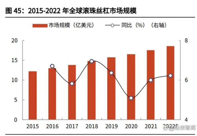 從市場空間來看,全球滾珠絲杠市場規(guī)模穩(wěn)健增長,中國已成為最重要的消費市 場之一,長期成長空間可觀。根據(jù)秦川機床公告,2016-2021 年全球滾珠絲杠市 場規(guī)模從 13.1 億美元增長至17.5 億美元;同期我國滾珠絲杠市場規(guī)模從 16.8 億元增長至25.6 億元。中國已成為滾珠絲杠產(chǎn)品重要的消費市場之一,約占全 球規(guī)模總量的 20%左右。從市場競爭格局看,目前全球主要的滾珠絲杠廠商有 NSK、THK、SKF 等,根 據(jù)華經(jīng)產(chǎn)業(yè)研究院統(tǒng)計,2021 年 CR5 銷售額市占率達到約 46%,其中主要來自 歐洲和日本,日本和歐洲滾珠絲杠企業(yè)占據(jù)了全球約 70%的市場份額。