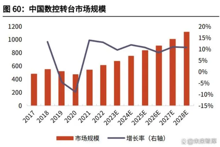 大陸及中國臺灣地區(qū)生產(chǎn)廠家生產(chǎn)的中低檔數(shù)控轉(zhuǎn)臺占據(jù)了我國大部分的轉(zhuǎn)臺 市場;少部分市場由美國、德國、日本等國家公司生產(chǎn)的高端產(chǎn)品所占據(jù)。內(nèi)地 最具競爭力的數(shù)控轉(zhuǎn)臺生產(chǎn)廠家是煙臺環(huán)球機床附件集團有限公司,該廠家的產(chǎn) 品體系完備,規(guī)格齊全,種類繁多,且設計開發(fā)和制造方面具備豐富的經(jīng)驗。中 國臺灣地區(qū)的德川機械股份有限公司是專業(yè)數(shù)控轉(zhuǎn)臺生產(chǎn)廠商之一。國外有日本 的 NIKKEN(日研)、德國 Peiseler、美國 HASS 公司等專業(yè)的生產(chǎn)廠家。國內(nèi) 生產(chǎn)的數(shù)控轉(zhuǎn)臺產(chǎn)品與國外的產(chǎn)品相比,在精度、速度及可靠性等參數(shù)上仍與國 外數(shù)控轉(zhuǎn)臺存在一定差距。2021 年中國數(shù)控轉(zhuǎn)臺市場銷售收入達到了 5.43 億美元,據(jù) QYResearch 預計, 2028 年可以達到 11.17 億美元。從產(chǎn)品類型及技術方面來看,單軸占有重要地位,2021 年份額達到 89.43%, 銷量達到 58678 臺,而雙軸由于價格較貴,從 2021 年銷量上來看僅為單軸的 1/9,達到 6935 臺,但銷售額超過單軸的 1/3,達到 1.44 億美元。預計未來單 軸和雙軸的比例穩(wěn)定,在 2028 年,單軸的銷量將達到 104280 臺,而雙軸達到 13671 臺。從產(chǎn)品市場應用情況來看,與立式數(shù)控機床配套使用的數(shù)控轉(zhuǎn)臺最多,接近 60%,在 2021 年達到 38816 臺,而臥式和龍門分別達到 19330 臺與 7467 臺。未來增長速度最快的為龍門數(shù)控機床,2022-2028 年的 CAGR 達到 9.69%。目 前中國主要廠商包括旭陽國際精機、寶嘉誠、德川機械、潭佳精密科技和潭興精 工等,2021 年 Top5 廠商份額占比超過 50%。