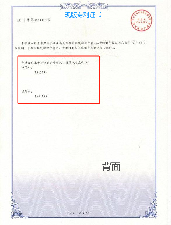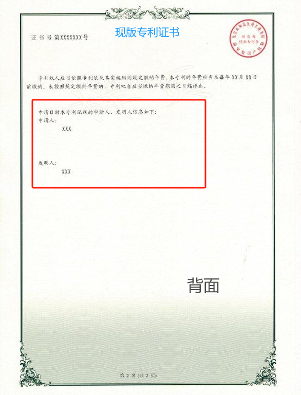 2.專利申請(qǐng)日時(shí)申請(qǐng)人、發(fā)明人信息,從證書背面來(lái)到證書正面。