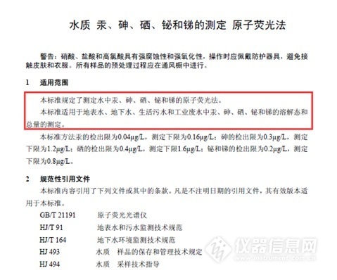 為貫徹《中華人民共和國環境保護法》和《中華人民共和國水污染防治法》,保護環境和人體健康,環境保護部科技標準司組織制定了環境保護標準《水質 汞、砷、硒、鉍和銻的測定 原子熒光法》(HJ694—2014),規定了水中汞、砷、硒、鉍和銻的原子熒光檢測方法。該標準適用于地表水、地下水、生活污水和工業廢水中汞、砷、硒、鉍和銻的溶解態和總量的測定。