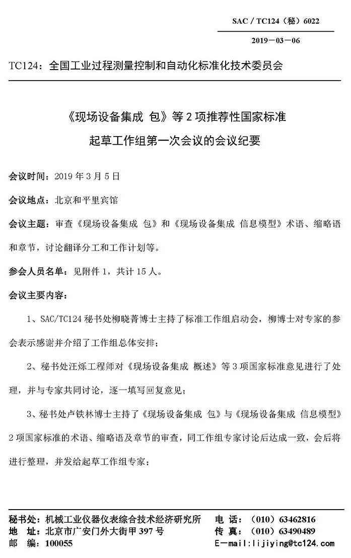 為解決當(dāng)前智能制造在集成和互聯(lián)互通標(biāo)準(zhǔn)化方面存在的問(wèn)題,根據(jù)國(guó)家標(biāo)準(zhǔn)制修訂細(xì)則的要求,經(jīng)研究決定,全國(guó)工業(yè)過(guò)程測(cè)量控制和自動(dòng)化標(biāo)準(zhǔn)化技術(shù)委員會(huì)成立了2019年度 SAC/TC124國(guó)家智能制造標(biāo)準(zhǔn)《現(xiàn)場(chǎng)設(shè)備集成》(第 4~5部分)起草工作組,并于2019年3月5日在北京召開(kāi)第一次工作組會(huì)議。此次大會(huì)有來(lái)自全國(guó)工業(yè)控制領(lǐng)域的十九位資深專家和一些長(zhǎng)期從事標(biāo)準(zhǔn)編寫工作的人員參與,作為長(zhǎng)期主持或參與國(guó)家標(biāo)準(zhǔn)制定的福建順昌虹潤(rùn)精密儀器有限公司,也派副總陳志揚(yáng)參加了這次的啟動(dòng)大會(huì)。