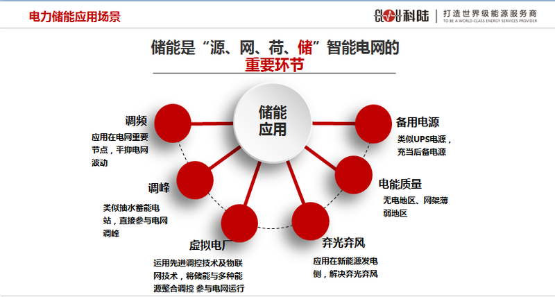 在促進清潔能源消納方面,國網提出將用市場辦法引導用戶參與調峰調頻,重點通過虛擬電廠和多能互補提高分布式新能源的友好并網水平和電網可調控容量占比,基于電力市場實現集中式新能源省間交易和分布式新能源省內交易,緩解棄風棄光,促進清潔能源消納。而儲能在電網側、新能源發電側、電力市場以及綜合能源服務均有重要應用。