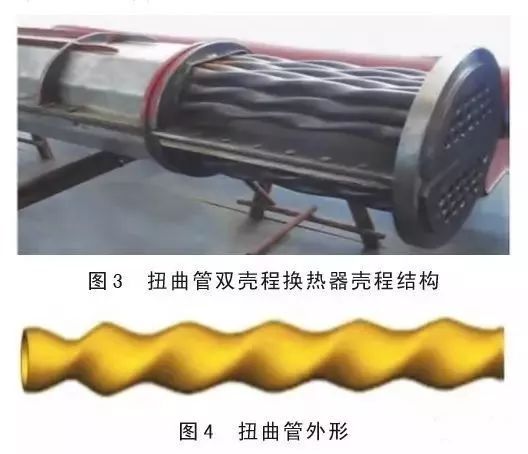 扭曲管換熱器是實現(xiàn)換熱器管程和殼程整體強化的一種換熱器。該類型換熱器采用螺旋扭曲管為傳熱元件,管程流體產(chǎn)生以旋轉(zhuǎn)擾動為主要特征的流動,殼程靠排列緊湊的扭曲管外緣點的接觸起到相互支撐作用,并在換熱管間形成連續(xù)的螺旋流動,殼程無折流板,流體無流動死區(qū),強化了傳熱效果(圖3、圖4)。