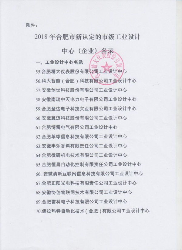 根據(jù)《合肥市市級(jí)工業(yè)設(shè)計(jì)中心認(rèn)定管理辦法(試行)》有關(guān)規(guī)定,經(jīng)申報(bào)、評(píng)審、現(xiàn)場(chǎng)查驗(yàn)、公示等程序,“合肥精大儀表股份有限公司工業(yè)設(shè)計(jì)中心”被評(píng)定為合肥市市級(jí)工業(yè)設(shè)計(jì)中心。詳見(jiàn)“合經(jīng)信科技【2018】526號(hào)”。