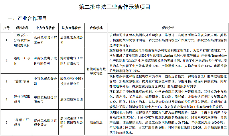 為深入貫徹中法兩國(guó)元首關(guān)于加強(qiáng)產(chǎn)業(yè)戰(zhàn)略全方位對(duì)接的重要共識(shí),落實(shí)第六次中法高級(jí)別經(jīng)濟(jì)財(cái)金對(duì)話有關(guān)“發(fā)布第二批智能制造、綠色制造、教育培訓(xùn)等領(lǐng)域的中法工業(yè)合作示范項(xiàng)目清單”的政策成果,打造一批中法工業(yè)合作先進(jìn)典型,在工業(yè)和信息化部與法國(guó)經(jīng)濟(jì)和財(cái)政部企業(yè)總署指導(dǎo)下,工業(yè)和信息化部國(guó)際經(jīng)濟(jì)技術(shù)合作中心與法國(guó)未來(lái)工業(yè)聯(lián)盟共同征集評(píng)選了第二批中法工業(yè)合作示范項(xiàng)目,并于7月5日在中法產(chǎn)業(yè)合作圓桌會(huì)上正式發(fā)布。