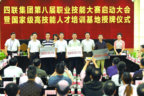 近日,四聯集團舉行國家級高技能人才培訓基地授牌儀式,四聯集團黨委副書記、紀委書記、工會主席黃治華、副總經理陳紅兵,四川儀表工業學校黨委書記柴彬堂為三個基地授牌。