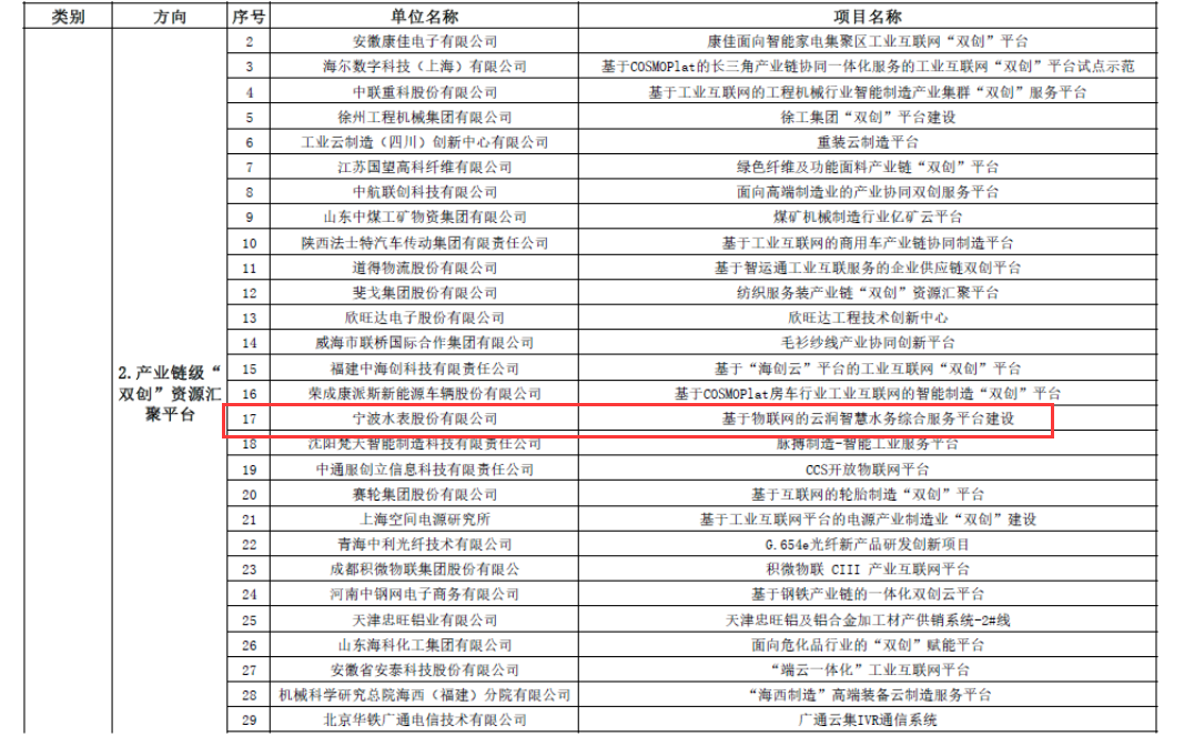 近日,國家工信部公示了2019年制造業(yè)“雙創(chuàng)”平臺試點示范項目名單,經(jīng)企業(yè)自主申報、地方推薦和專家評審,寧波水表股份有限公司的“基于物聯(lián)網(wǎng)的云潤智慧水務綜合服務平臺建設”被評為產(chǎn)業(yè)鏈級“雙創(chuàng)”資源匯聚平臺方向的試點示范項目,成為此次國內(nèi)唯一一家面向智慧水務領域的示范試點項目。
