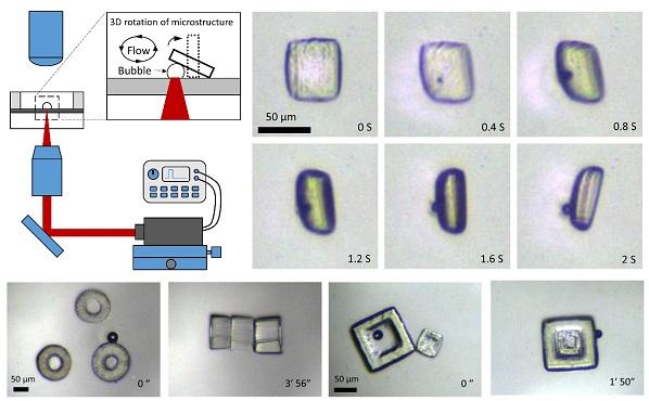 沈陽自動化所微納米課題組針對上述問題利用液體環境中的氣泡作為微型機器人,對微結構進行三維操作和組裝。科研人員研究了光熱效應產生和控制氣泡的方法,利用氣泡微型機器人對水凝膠微結構進行了多種操作,包括二維移動、旋轉和三維翻轉等,實現了對微結構的三維姿態控制。綜合上述操作方法,通過氣泡微型機器人可將多個微模塊組裝成復雜的三維結構,為微結構的操作及裝配,體外構建生物組織結構提供了新的解決方案。