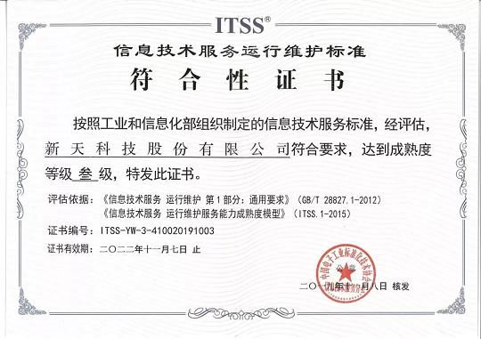 新天科技以完善的運(yùn)維服務(wù)制度、流程為基礎(chǔ),以先進(jìn)、成熟的運(yùn)維管理平臺為手段,以高素質(zhì)的運(yùn)維服務(wù)隊(duì)伍為保障,整合運(yùn)維服務(wù)資源,規(guī)范運(yùn)維行為,確保服務(wù)質(zhì)效,形成統(tǒng)一管理、集約高效的一體化運(yùn)維體系,從而保障數(shù)據(jù)集中條件下網(wǎng)絡(luò)和應(yīng)用系統(tǒng)安全、穩(wěn)定、高效、持續(xù)運(yùn)行。最終以優(yōu)異的成績順利通過專家組評審,于2019年11月8日,榮獲“ITSS信息技術(shù)服務(wù)標(biāo)準(zhǔn)符合性證書”。這標(biāo)志著新天科技IT服務(wù)管理水平達(dá)到工業(yè)和信息化部最高標(biāo)準(zhǔn)。