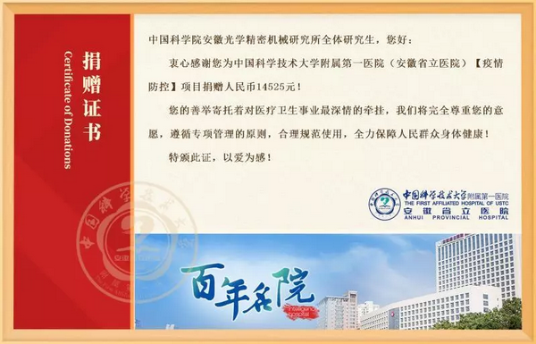 一方有難,八方支援。愛心捐款倡議發出后,黨員研究生帶頭響應,大家各盡所能。募捐活動結束后,安光所各研究生黨支部及安光所研究生會對此次捐款活動款項明細進行公示。據統計,共收到152位同學的愛心捐款,籌集善款14525元。所有善款最后統一轉賬至中國科學技術大學附屬第一醫院(即安徽省立醫院,安徽省新型冠狀病毒感染的肺炎醫療救治省級定點醫院),并注明用于新冠肺炎疫情防控工作。