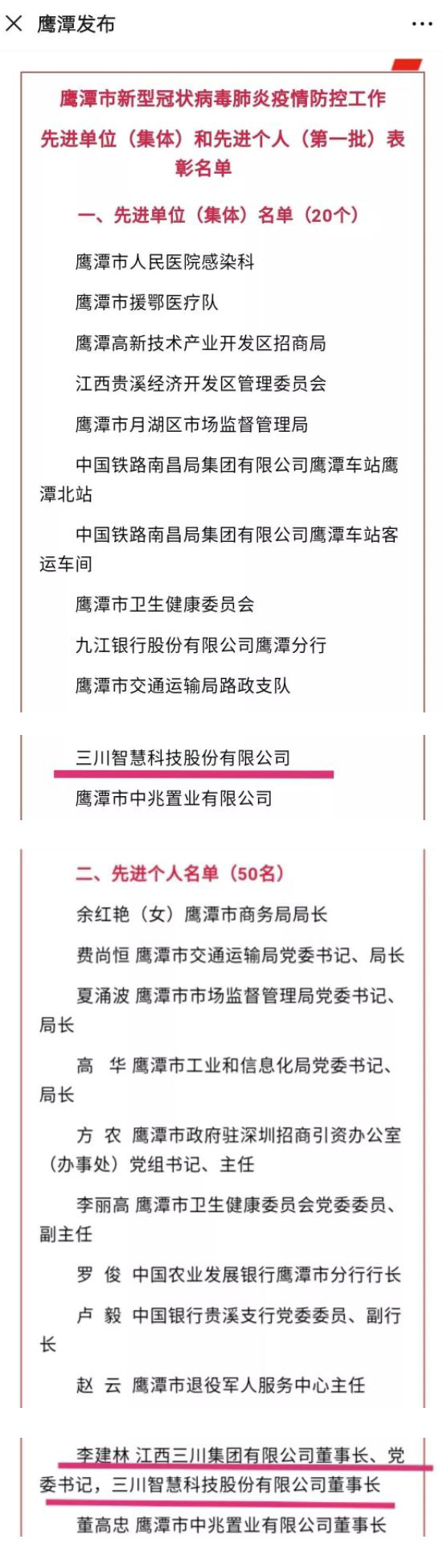 三川智慧榮獲疫情防控工作先進單位 三川智慧董事長榮