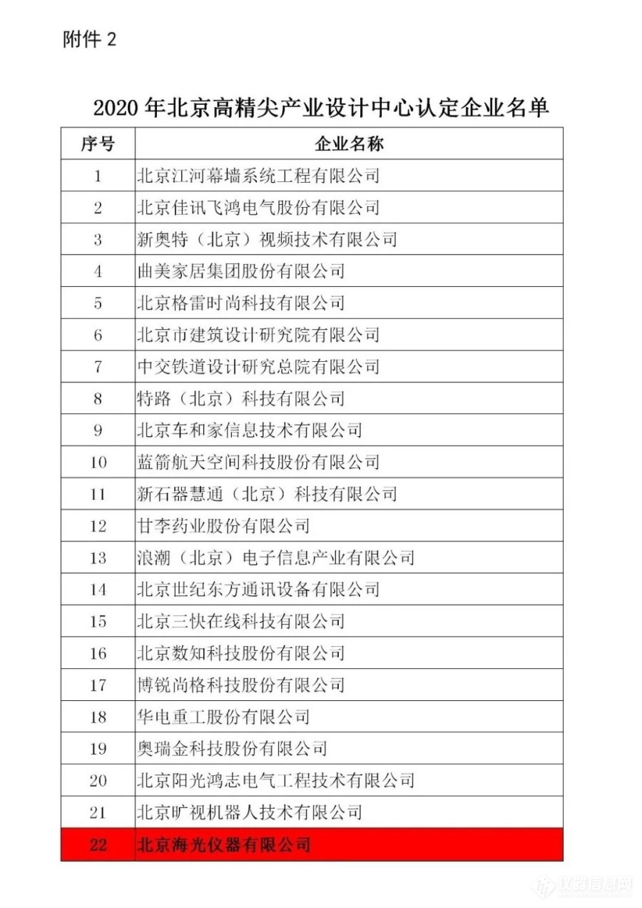 近日,北京市經濟和信息化局公布了2020年北京高精尖產業設計中心認定及復核結果,北京海光儀器有限公司(簡稱“海光公司”)榜上有名,被認定為北京高精尖產業設計中心。