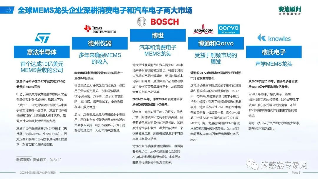 MEMS產(chǎn)業(yè)從上個世紀(jì)八十年代初開始規(guī)模應(yīng)用,經(jīng)過將近四十年的發(fā)展,已經(jīng)形成了一批國際上領(lǐng)先企業(yè),有ST、博通、博世,有一個特點,日韓和臺灣企業(yè)比較少,主要是歐美企業(yè),縱觀經(jīng)濟變遷,包括新型顯示、集成電路都有這個特點,現(xiàn)在MEMS產(chǎn)業(yè)領(lǐng)導(dǎo)廠商,仍然是美國和歐洲企業(yè)。