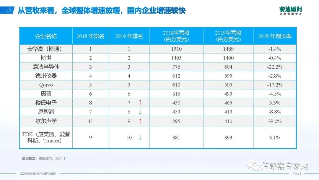 在全球MEMS廠商格局中,我們作為后來者,其實差距并不大,歌爾聲學(xué)現(xiàn)在是全球第九大廠商。在2019年全球不景氣的情況下,國內(nèi)企業(yè)依然保持高速的增長,再次引證國內(nèi)企業(yè)作為后發(fā)優(yōu)勢,趕超正多其時。