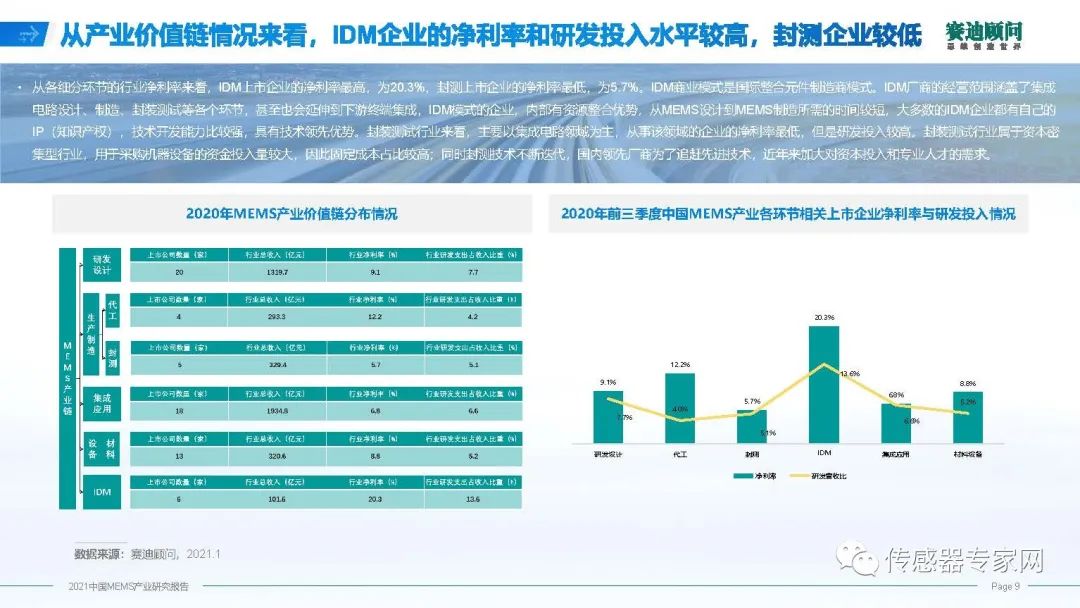 看投資收益、發(fā)展前景,實事求是的講,現(xiàn)在MEMS行業(yè)凈利潤率并不高,10%左右,IDM凈利潤率最高,超過20%,代工行業(yè)利潤率比較高,達到12%。在研發(fā)投入上,研發(fā)能力遠遠不足,基本上在10%,IDM比較高,超過了10%。