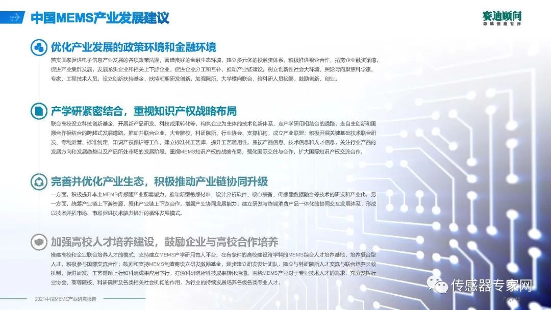 3、完善并優(yōu)化產(chǎn)業(yè)生態(tài),積極推動產(chǎn)業(yè)鏈協(xié)同升級,一方面,積極提升本土MEMS傳感器產(chǎn)業(yè)配套能力,推動新型敏感材料、設(shè)計分析軟件、核心裝備、傳感器數(shù)據(jù)融合等技術(shù)的研發(fā)和產(chǎn)業(yè)化。另一方面,統(tǒng)籌產(chǎn)業(yè)鏈上下游資源,強化產(chǎn)業(yè)鏈上下游合作,增強產(chǎn)業(yè)協(xié)同發(fā)展能力。