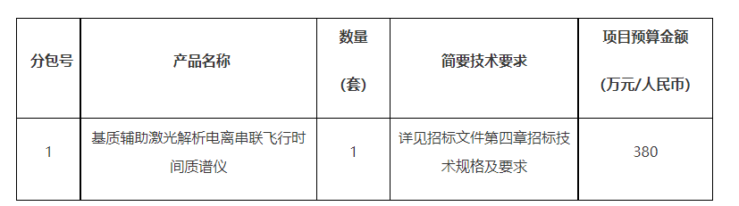 基質輔助激光解析電離串聯飛行時間質譜儀 招標項目的潛在投標人應在江蘇蘇美達儀器設備有限公司,南京市長江路198號14樓獲取招標文件,并于2023年04月12日 14點00分(北京時間)前遞交投標文件。