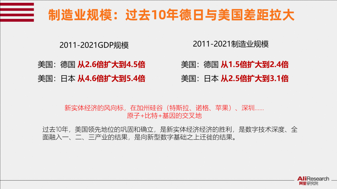 然而事實是,在過去的十年,德國、日本的GDP規(guī)模與美國的差距在拉大:從2011到2021年,美國GDP從相當于德國的2.6倍擴大到了4.5倍,相當于日本的4.6倍擴大到了5.4倍;更值的關(guān)注的是,就制造業(yè)而言,德國、日本的制造業(yè)規(guī)模與美國的差距仍在拉大:2011到2021年,美國制造業(yè)規(guī)模相當于德國的1.5倍擴大到2.4倍,相當于日本的2.5倍擴大到3.1倍。制造業(yè)領(lǐng)域美國正在涌現(xiàn)出一批具有全球競爭力的數(shù)字原生企業(yè),美國制造業(yè)仍然以比日本和德國更快的速度發(fā)展。