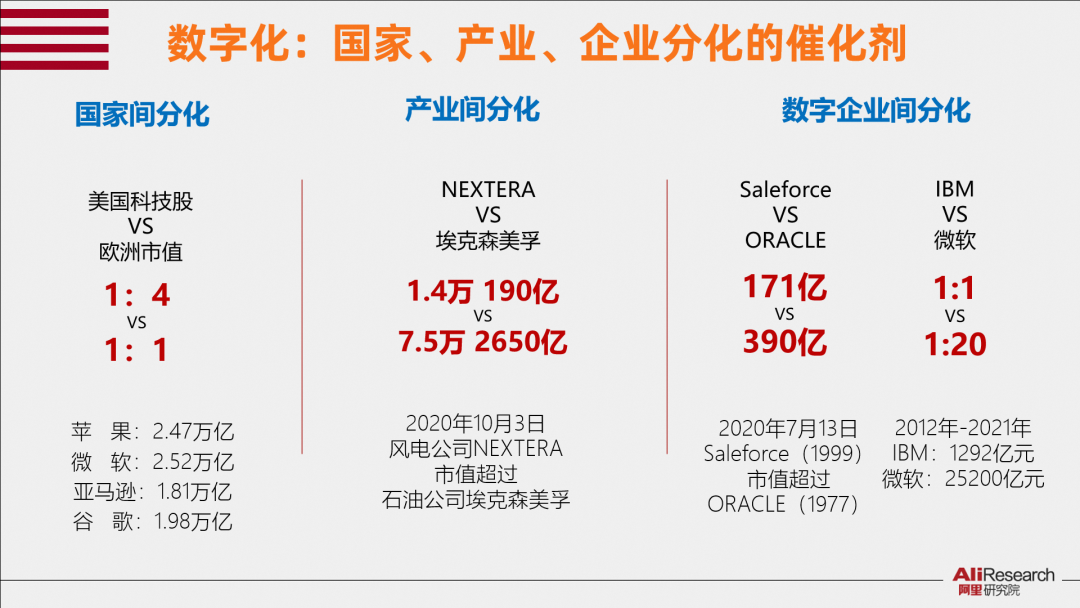 疫情前,美國所有科技公司的估值僅相當于歐洲所有國家上市公司估值的1/4。疫情后,美國科技公司的估值已經(jīng)超過了歐洲所有國家上市公司總估值。今天,銷售額只有190億美元的新能源風電公司NEXTER的市值,已經(jīng)超過了曾經(jīng)的全球市值最大公司艾克森美孚。ICT產(chǎn)業(yè)內(nèi)部也在急劇分化,IBM、微軟在十年前的市值都差不多 ,但今天微軟市值已經(jīng)相當于IBM的10-20倍。