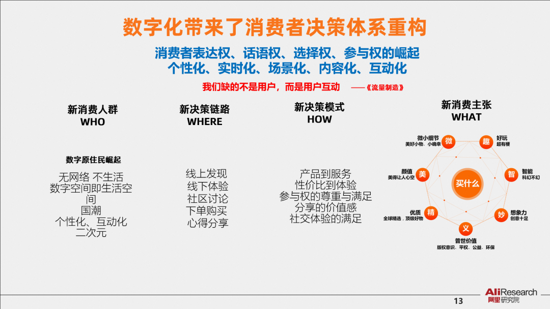 數(shù)字技術(shù)不僅僅武裝起供給體系,也武裝起了消費者,需求巨變是數(shù)字化轉(zhuǎn)型的邏輯起點。一是新消費群體崛起,今天的00后和95后被稱為數(shù)字原住民,他們無網(wǎng)絡(luò)不生活,數(shù)字間空即生活空間,追求個性化、二次元,他們在重新定義什么是豪華車;二是決策鏈路變化,線上發(fā)現(xiàn)、線下體驗、下單夠買、社群討論、心得分享;三是決策模式變了,關(guān)注點從過去的價格、性價比變?yōu)榻裉斓膮⑴c感、分享、社交體驗等等。四是購買的產(chǎn)品和服務也變了。今天需求越來越個性化、實時化、場景化、內(nèi)容化、互動化等,消費者擁有了更多的話語權(quán)、表達權(quán)和選擇權(quán)。問題是,供給端能否跟上變化?一本叫做《流量制造》的書說得很好:我們?nèi)钡牟皇怯脩簦桥c用戶的互動。