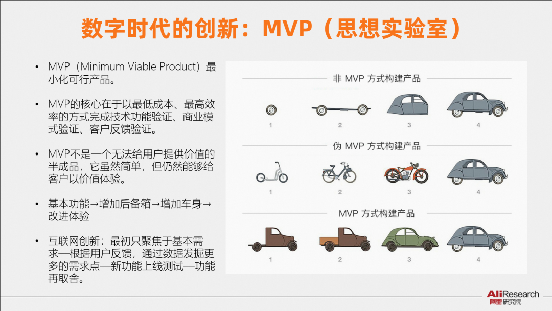面對需求的巨變,企業(yè)構(gòu)建一個思想實驗室:MVP(Minimum Viable Product)最小化可行產(chǎn)品。MVP的核心在于以最低成本、最高效率的方式完成技術(shù)功能驗證、商業(yè)模式驗證、客戶反饋驗證。MVP不是一個無法給用戶提供價值的半成品,它雖然簡單,但仍然能夠給客戶以價值體驗。如開發(fā)一輛汽車,其路徑是,基本功能→增加后備箱→增加車身→改進體驗。如同互聯(lián)網(wǎng)的創(chuàng)新:最初只聚焦于基本需求—根據(jù)用戶反饋,通過數(shù)據(jù)發(fā)掘更多的需求點—新功能上線測試—功能再取舍。