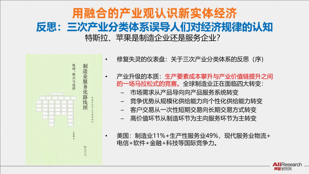 我在10年前出版的著作《制造業(yè)服務路線圖》中,就提出一個有爭議的觀點,當我們重新思考制造業(yè)和服務發(fā)展實踐時,需要反思:100年前提出的三次產(chǎn)業(yè)分類體系會不會誤導人們對經(jīng)濟規(guī)律的認知。基于現(xiàn)有的經(jīng)濟常識:特斯拉、蘋果是制造業(yè)公司還是服務業(yè)公司?這個其實是說不清楚的,它們已經(jīng)融合了。