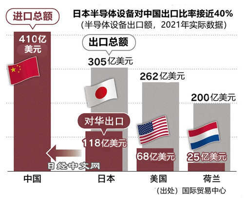 聯(lián)合國(guó)國(guó)際貿(mào)易中心的統(tǒng)計(jì)顯示,日本2021年向中國(guó)本土出口的制造設(shè)備達(dá)到約120億美元,金額占出口到全世界的設(shè)備的近4成,在所有地區(qū)中最高。出口額是美國(guó)對(duì)華設(shè)備出口的近2倍。