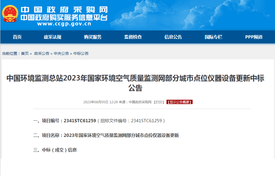 2023年6月5日,中國環境監測總站2023年國家環境空氣質量監測網部分城市點位儀器設備更新項目發布中標公告,先河環保成功中標第3包和第4包,金額2100萬元。公司將全力以赴認真履約,為我國生態環境監測網建設和深入打好藍天保衛戰提供技術和服務支撐。