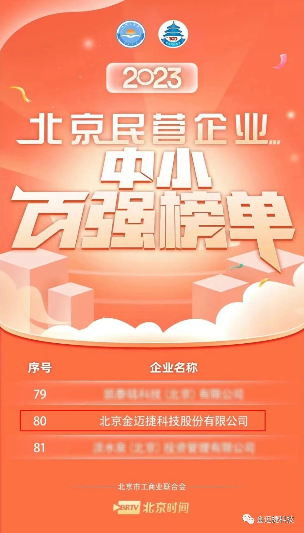 9月21日,北京市工商聯、北京市豐臺區人民政府聯合召開2023北京民營企業百強發布會,正式發布2023北京民營企業百強“1+4”榜單。金邁捷科技再次榮登“北京民營企業中小企業百強”榜單,這也是金邁捷科技連續2年上榜百強。