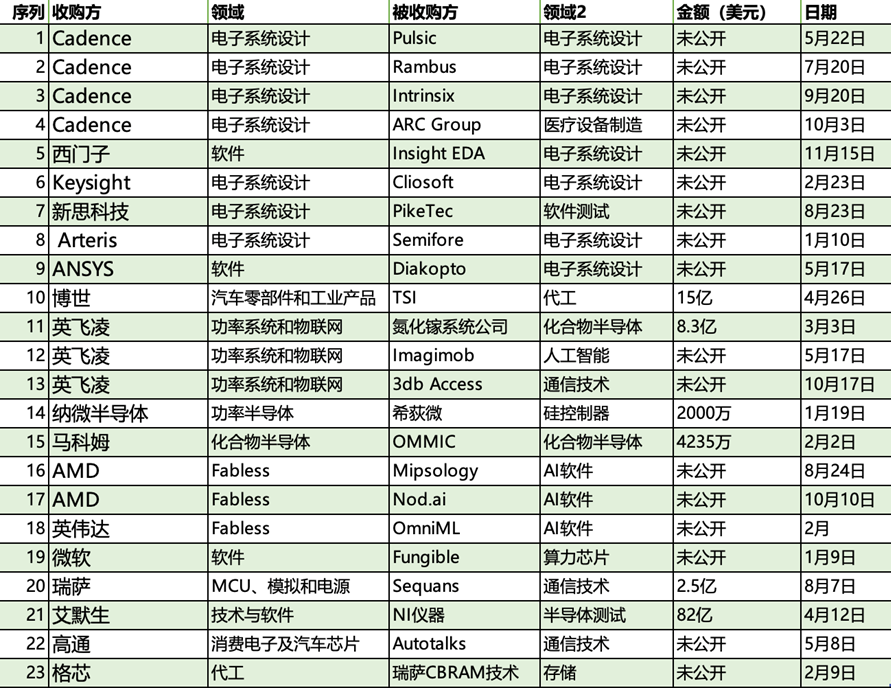 2023年,半導體市場的逆風周期仍未過去,企業收并購的腳步卻不曾停歇。根據公開的信息,記者梳理了23樁半導體領域的國際收并購案例,發現2023年全球半導體領域的收并購案主要集中在AIEDA、寬禁帶半導體等領域,呈現以下特點。