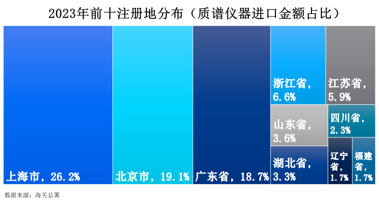 2023年質譜儀器進口額前十注冊地分別為上海市、北京市、廣東省、浙江省、江蘇省、山東省、湖北省、四川省、遼寧省以及福建省,占比分別為26.2%19.1%18.7%6.6%5.9%3.6%3.3%2.3%1.7%以及1.7%