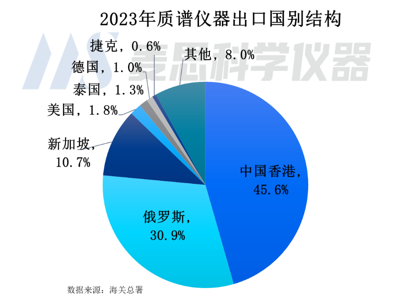 2023年質譜儀器出口國別結構看,排名前五位為中國香港(轉口貿易)、俄羅斯、新加坡、美國以及泰國,出口金額占比分別為45.6%30.9%10.7%1.8%以及1.3%