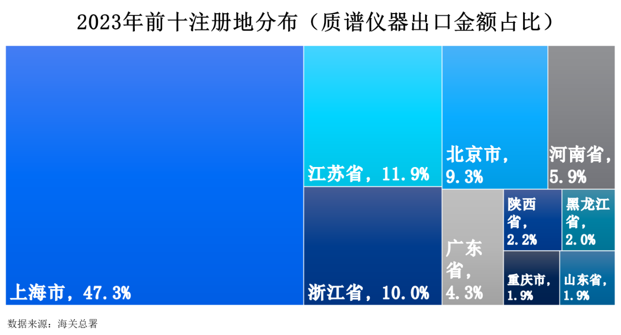 2023年質譜儀器出口額前十注冊地分別為上海市、江蘇省、浙江省、北京市、河南省、廣東省、陜西省、黑龍江省、重慶市和山東省,占比分別為47.3%11.9%10.0%9.3%5.9%4.3%2.2%2.0%1.9%1.9%