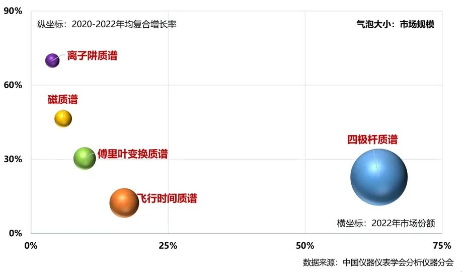 盡管離子阱質(zhì)譜、磁質(zhì)譜、傅里葉變換質(zhì)譜的市場(chǎng)占比較低,但2022年這三類質(zhì)量分析器質(zhì)譜儀器的市場(chǎng)增速較快,2020-2022年均復(fù)合增長(zhǎng)率高于30%,其中離子阱質(zhì)譜的增速最高,主要貢獻(xiàn)來(lái)自于離子阱液質(zhì)聯(lián)用儀、便攜式離子阱質(zhì)譜。