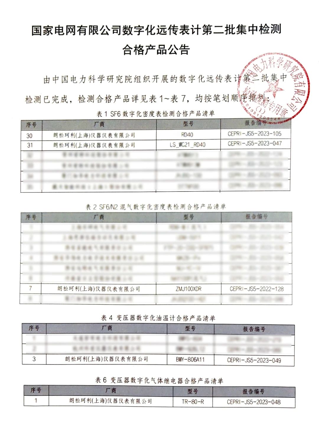朗松珂利作為專業(yè)數(shù)字化遠(yuǎn)傳表計生產(chǎn)廠家再次參與其中,并且多種數(shù)字化遠(yuǎn)傳表計均一次性通過了統(tǒng)一檢測。此次送樣產(chǎn)品種類較多,覆蓋較廣,包含有線SF6數(shù)字化密度表、無線SF6數(shù)字化密度表、SF6/N2混合氣體數(shù)字化密度表、變壓器數(shù)字化油溫計和變壓器數(shù)字化氣體繼電器等。