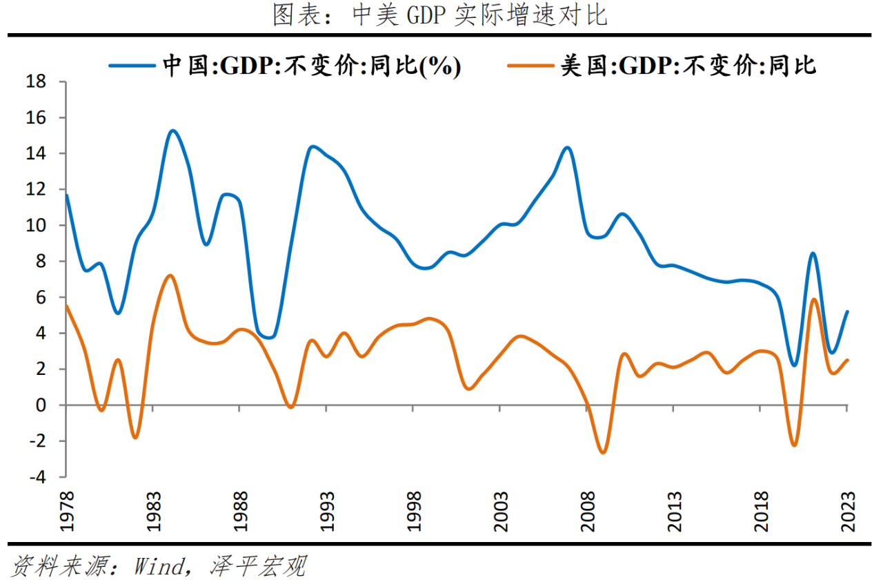 2023年中國(guó)GDP規(guī)模達(dá)126萬億元,相當(dāng)于17.9萬億美元,保持世界第二大經(jīng)濟(jì)體地位。美國(guó)2023年GDP為27.4萬億美元,中國(guó)GDP相當(dāng)于美國(guó)的約65.4%,受匯率影響,中美差距略有擴(kuò)大。2023年中國(guó)GDP實(shí)際增速5.2%,低于1978-2008年高速增長(zhǎng)期的平均增速9.8%,高于美國(guó)的2.5%,越南、印度經(jīng)濟(jì)增速分別為5.1%和6.7%。
