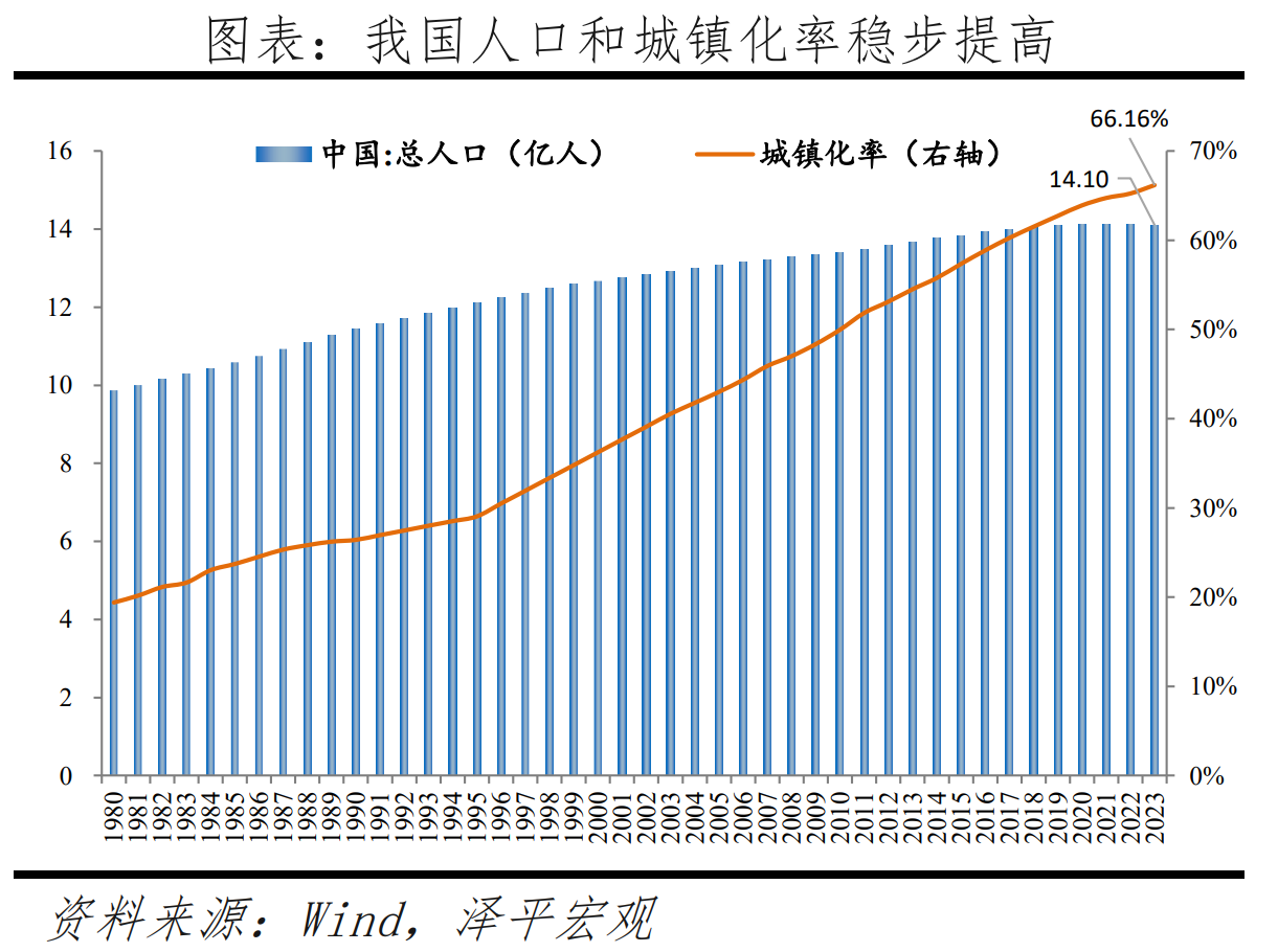 2023年末常住人口城鎮(zhèn)化率達(dá)66.16%,較上年末提高0.94個(gè)百分點(diǎn),標(biāo)志著當(dāng)前我國(guó)新型城鎮(zhèn)化進(jìn)程穩(wěn)步推進(jìn),但較高收入經(jīng)濟(jì)體的81.3%仍有15.1個(gè)百分點(diǎn)的空間。過去四十年,中國(guó)城鎮(zhèn)常住人口從1.7億快速增至9.3億,凈增加7.6億,城鎮(zhèn)化率從17.9%提升至66.2%,提高48.3個(gè)百分點(diǎn),深刻地改變了中國(guó)經(jīng)濟(jì)社會(huì)格局,成就了過去中國(guó)重化工業(yè)、大規(guī)模基礎(chǔ)設(shè)施投資、房地產(chǎn)、消費(fèi)升級(jí)等的飛速發(fā)展。當(dāng)前中國(guó)城鎮(zhèn)化率已高于55.3%的世界平均水平,達(dá)到中高收入經(jīng)濟(jì)體水平,但明顯低于高收入經(jīng)濟(jì)體的81.3%,中國(guó)城鎮(zhèn)化還有約15.1個(gè)百分點(diǎn)的空間。