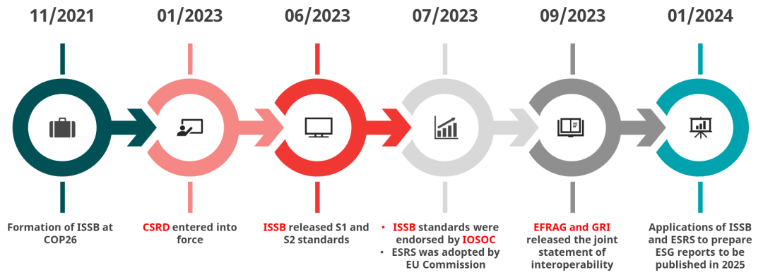 * 2023年6月26日,國際可持續準則理事會(ISSB)發布了首批兩項可持續報告披露準則S1(一般要求準則)和S2(氣候披露準則)。