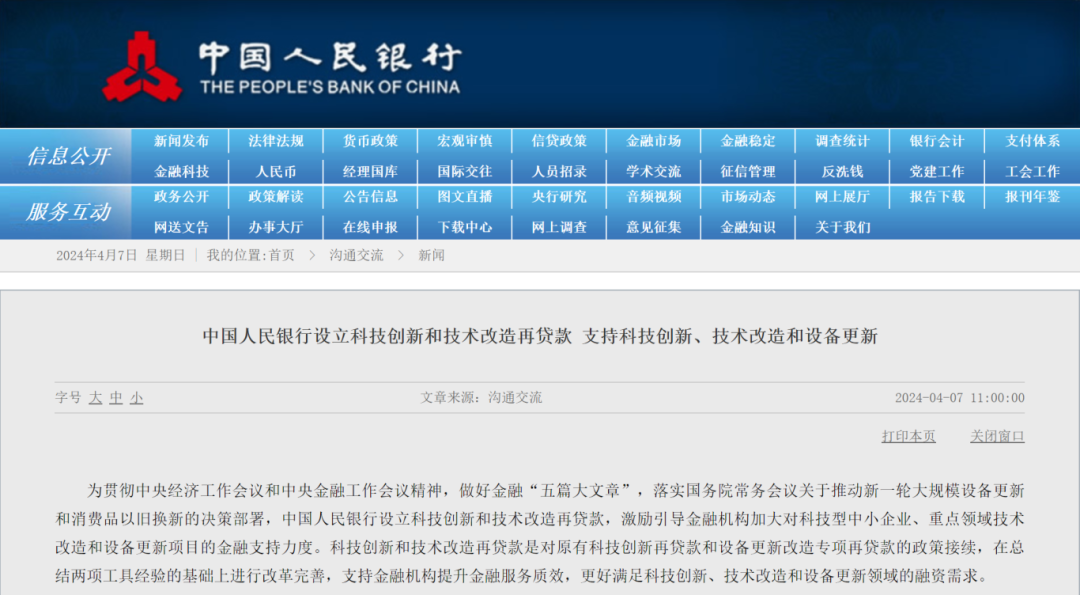47日,據央行官網消息,為貫徹中央經濟工作會議和中央金融工作會議精神,做好金融“五篇大文章”,落實國務院常務會議關于推動新一輪大規模設備更新和消費品以舊換新的決策部署,中國人民銀行設立科技創新和技術改造再貸款,激勵引導金融機構加大對科技型中小企業、重點領域技術改造和設備更新項目的金融支持力度。