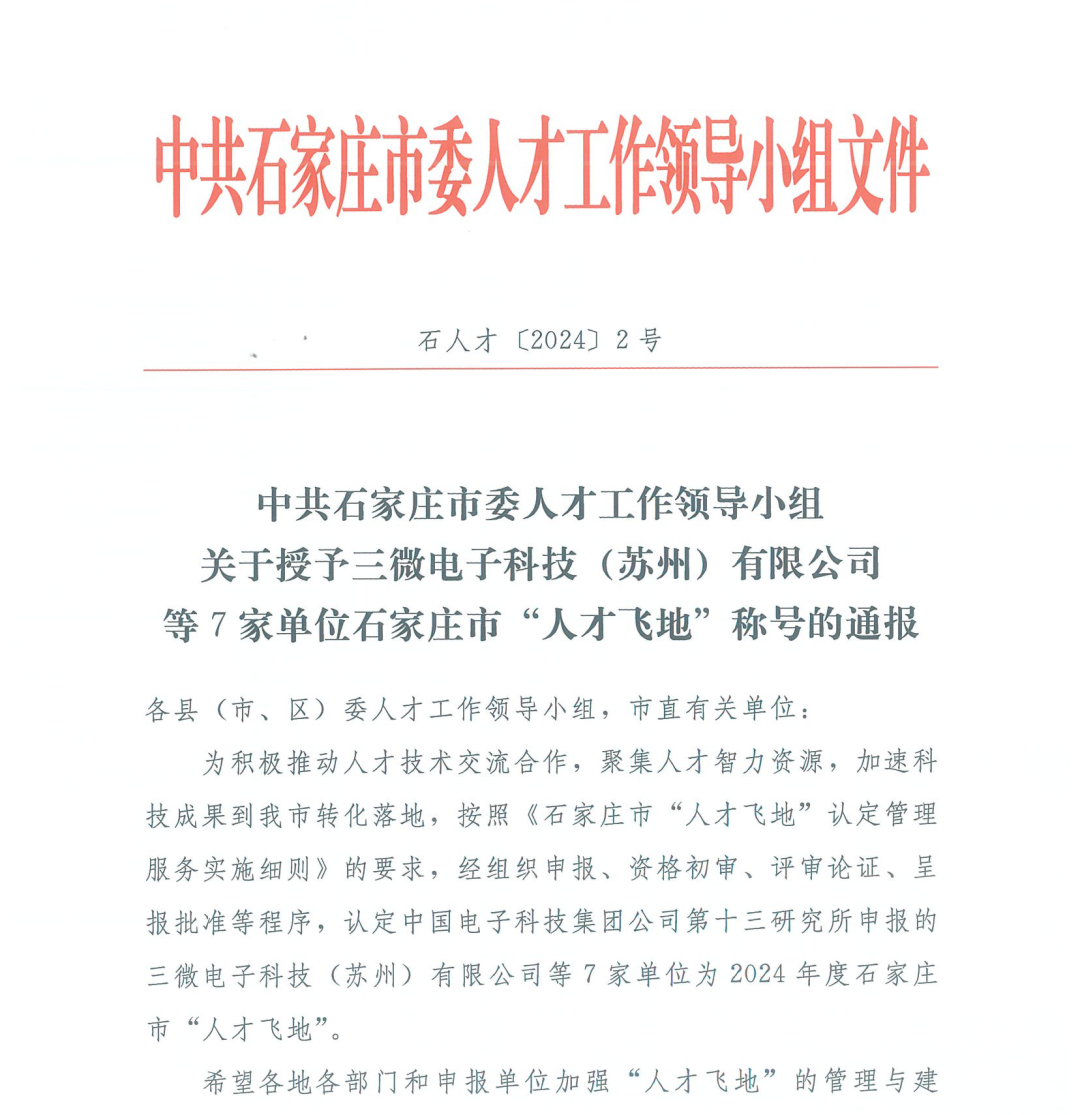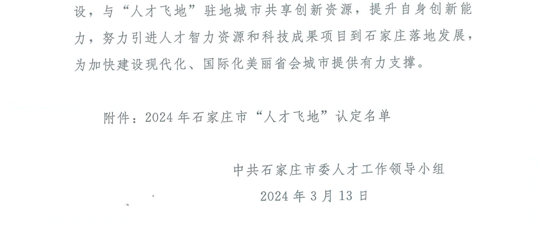 近日,中共石家莊市委人才工作領導小組對2024年度石家莊市“人才飛地”認定結果進行通報,北京生態中潤科技有限公司作為先河環保北京研發中心載體,正式被認定為石家莊市“人才飛地”稱號。