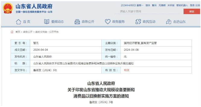 4月8日,《山東省人民政府關(guān)于印發(fā)山東省推動大規(guī)模設(shè)備更新和消費品以舊換新實施方案的通知》對外發(fā)布。