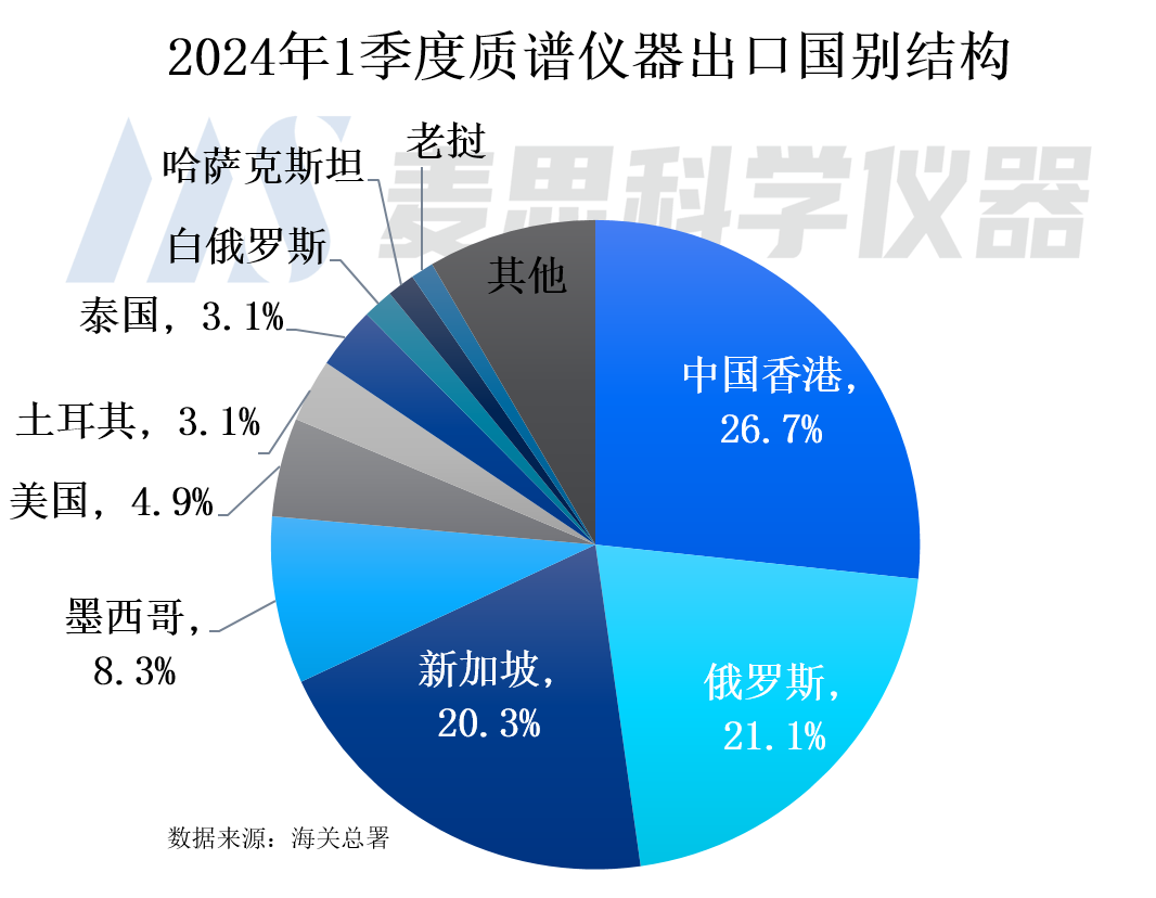 20241季度質譜儀器進口國別結構看,排名前五位為新加坡、德國、美國、日本以及愛爾蘭,進口金額占比分別為28.8%26.3%23.6%7.7%以及5.3%