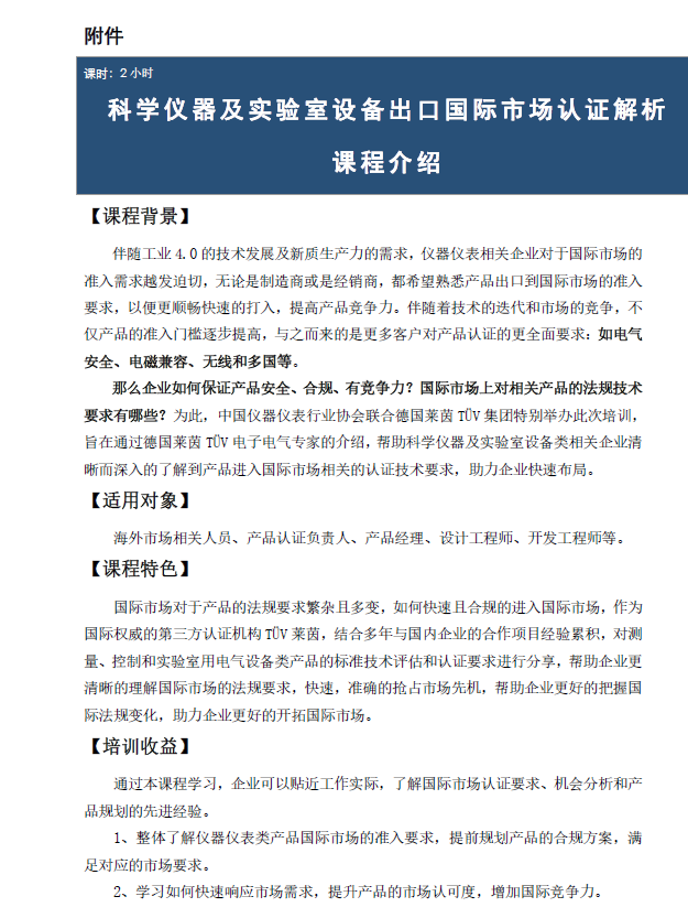 附件:科學(xué)儀器及實(shí)驗(yàn)室設(shè)備出口國際市場認(rèn)證解析課程介紹