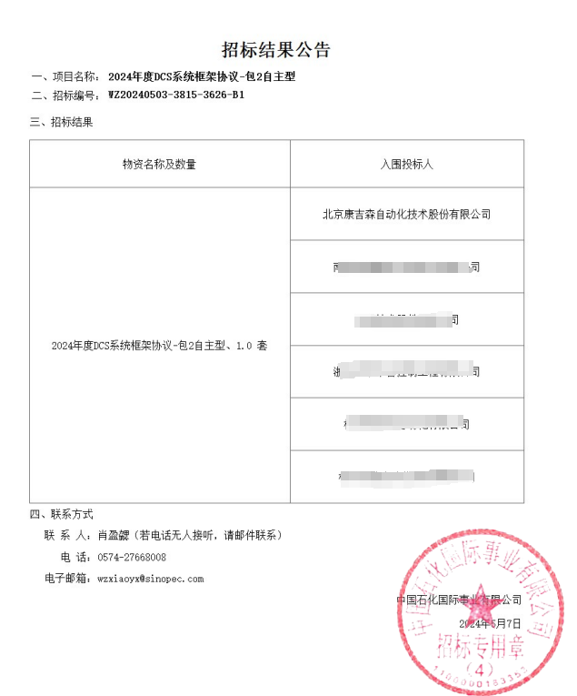 57日,北京康吉森自動化技術股份有限公司(下稱”康吉森“)以第一名的成績成功中標中國石油化工集團有限公司(下稱”中石化“)2024年度DCS國產化系統框架協議,成為在此標段時間范圍內的首選供應商!此次中標不僅展現了康吉森在DCS領域的技術實力和創新能力,也彰顯了中石化對控制系統國產化升級及自主可控戰略要求的高度重視。