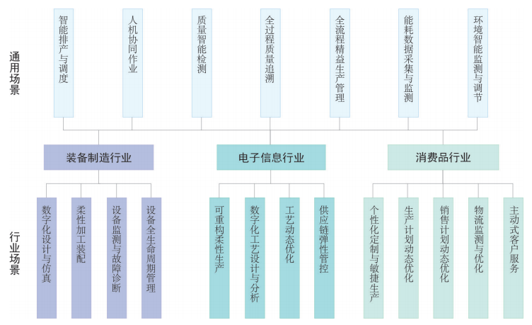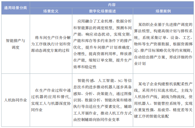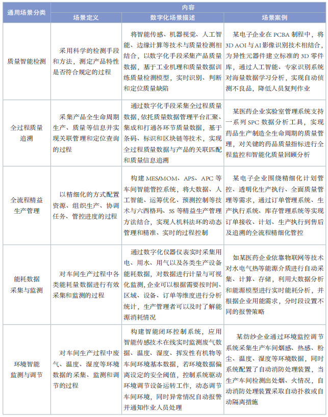 通用場景是指滿足不同行業(yè)數字化轉型共性需求的場景,具備在同行業(yè)內及不同行業(yè)間的推廣價值。通用場景部分整理了裝備制造、電子信息和消費品 3 個行業(yè)存在共性需求和相似解決方案的數字化典型場景,包括智能排產與調度、人機協同作業(yè)、質量智能檢測、全過程質量追溯、全流程精益生產管理、能耗數據采集與監(jiān)測、環(huán)境智能監(jiān)測與調節(jié) 7個場景,場景內容見表 1。