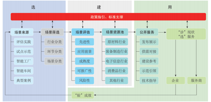 數字化場景資源池建設的關鍵是對外服務,以示范、參考、指導等方式助力企業(yè)數字化場景建設??梢酝ㄟ^平臺的方式公開發(fā)布優(yōu)秀場景案例、場景提供方名錄、技術邏輯方案等信息,為轉型企業(yè)和服務商打造精準高效的資源獲取和服務對接平臺。有轉型需求的企業(yè)可以通過信息發(fā)現、場景對比分析,“診”自身場景數字化現狀,快速錨準具體轉型場景,明確轉型方案和目標,同時“選”優(yōu)秀場景案例指導自身場景數字化建設。服務商可以通過場景對標分析,“診”自身數字化場景方案的成熟度和能力,“選”與自身同方向的優(yōu)秀場景指導方案優(yōu)化,持續(xù)提升服務能力。企業(yè)和服務商的成功實踐通過“驗”之后,將不斷轉化為資源池的場景來源,形成“選”“建”“用”的良性閉環(huán),不斷豐富資源池場景。