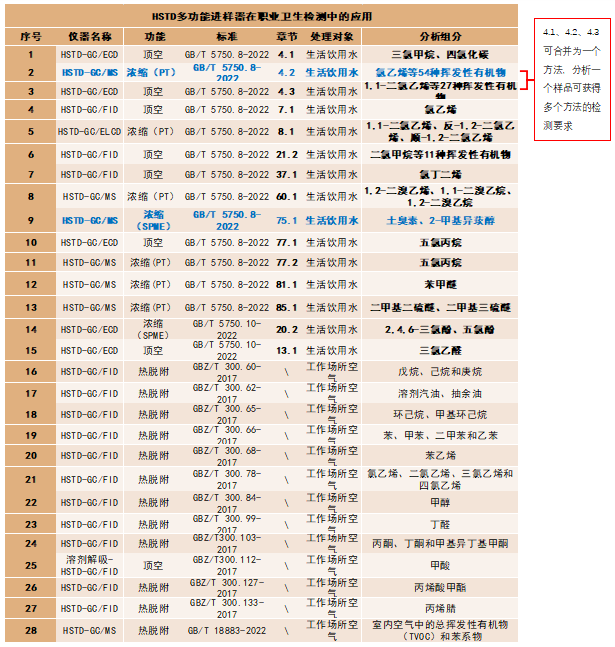 HSTD多功能進樣器具有多種氣相色譜前處理功能,所有功能共用一個GC輸入端,通過軟件切換不同功能,快捷方便,節(jié)省更換前處理設(shè)備的時間。下表為該多功能進樣器在職業(yè)衛(wèi)生檢測中能夠完成的檢測任務(wù)。