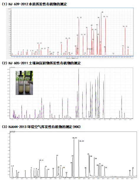 1-氯乙烯;2-1,1-二氯乙烯;3-二氯甲烷;4-反式-1,2-二氯乙烯;5-1,1-二氯乙烷;6/7-2,2-二氯丙烷,順式-1,2-二氯乙烯;8-溴氯甲烷;9-三氯甲烷;10-1,1,1-三氯乙烷;11/12-四氯化碳,1,1-二氯丙烯;13/14 -苯,1,2-二氯乙烷;15 -三氯乙烯;16 -1,2-二氯丙烷;17 -二溴甲烷;18-一溴二氯甲烷;19-反-1.3-二氯丙烯;20 -甲苯;21-順-1.3-二氯丙烯;22 -1,1,2-三氯乙烷;23/24 -四氯乙烯,1,3-二氯丙烷;25 -二溴氯甲烷;26-1,2-二溴乙烷;27 -氯苯;28-1,1,1,2-四氯乙烷;29 -乙苯;30/31-間二甲苯、對二甲苯;32/33-鄰二甲苯,苯乙烯;34 -溴仿;35 -異丙苯;36-溴苯;37/38-1,1,2,2-四氯乙烷,1,2,3-三氯丙烷;39-正丙苯;40-2-氯甲苯;41/42-4-氯甲苯,1,3,5-三甲基苯;43-叔丁基苯;44-1,2,4-三甲基苯;45-仲丁基苯;46-1,3-二氯苯;47/48-4-異丙基甲苯,1,2-二氯苯;49-正丁基苯;50-1,4-二氯苯;51-1,2-二溴-3-氯丙烷;52-1,2,4-三氯苯;53/54-六氯丁二烯,萘;55-1,2,3-三氯苯